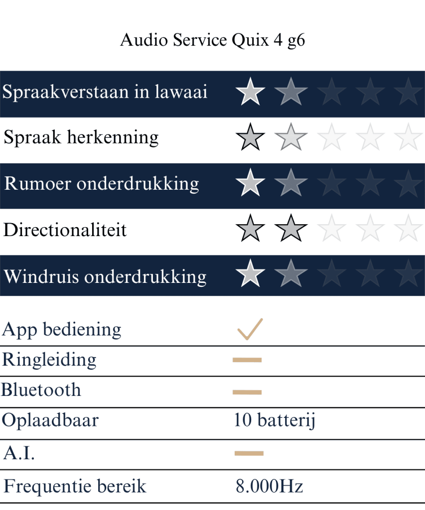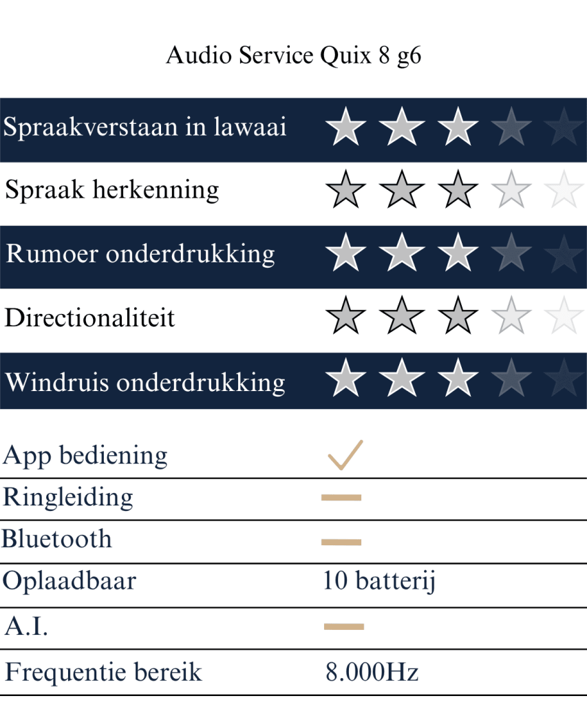 Kortom: de Audio Service Quix G6 is een gebruiksvriendelijk, comfortabel en geavanceerd hoortoestel dat direct klaar is voor gebruik en zich moeiteloos aanpast aan uw luisteromgeving.