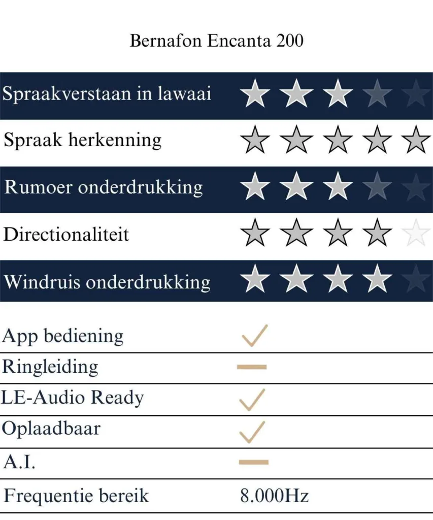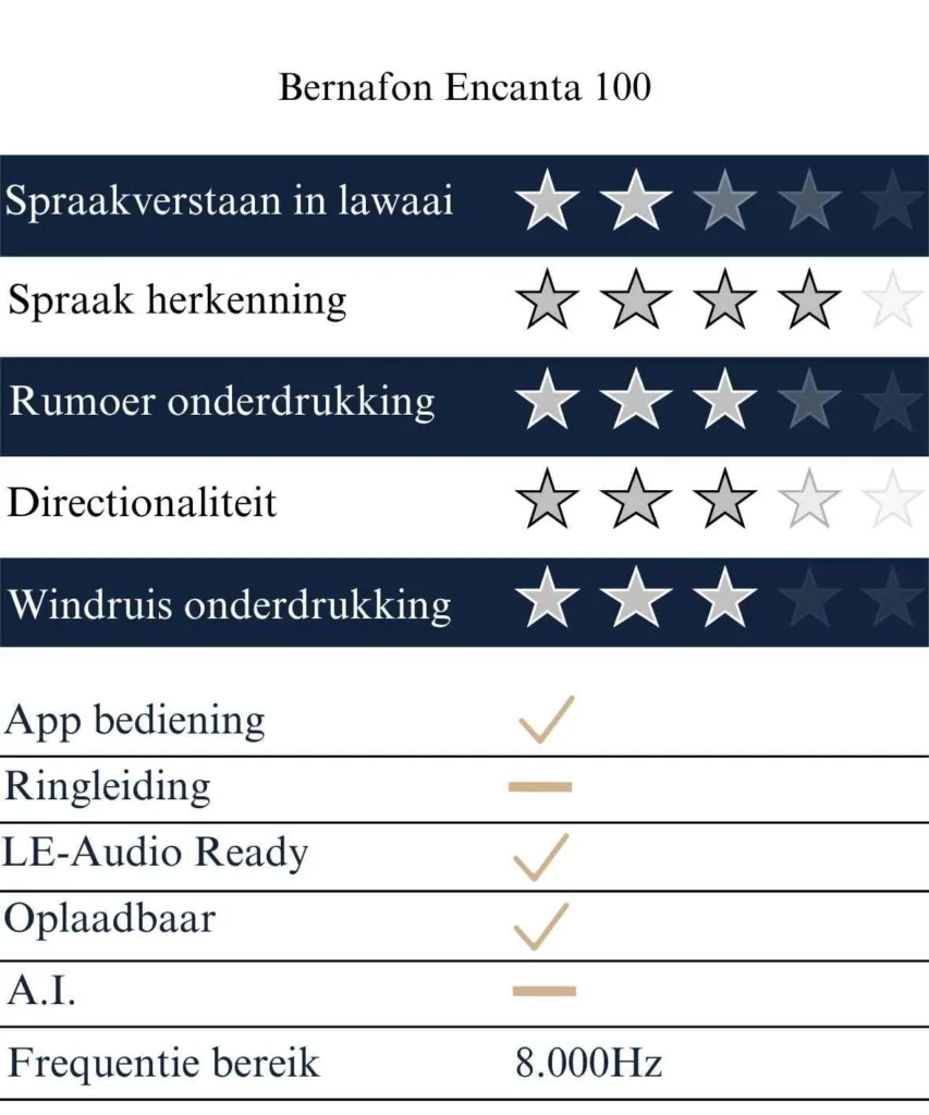 De Bernafon Encanta is één van de het meest geavanceerde hoortoestel binnen de vergoedingscategorieën. Dit toestel is voorzien van de basistechnologie van Encanta en is ontworpen om een hoge geluidskwaliteit en goede spraakverstaanbaarheid te bieden, ook in wat meer rumoerige omgevingen.