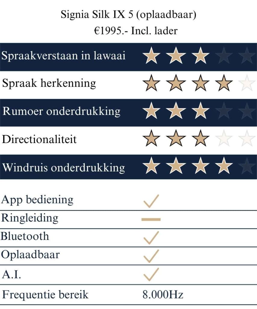 Samenvattend is de Signia Silk Charge&Go IX een innovatief CIC-hoortoestel dat direct te gebruiken is, oplaadbaar is, verbeterde audiologische prestaties biedt en een unieke directionele technologie bezit voor betere spraakverstaanbaarheid in rumoerige omgevingen…. De lange batterijduur en de mogelijkheid tot opladen onderweg, evenals de bediening via een app en aanpassing op afstand, dragen bij aan het gebruiksgemak.