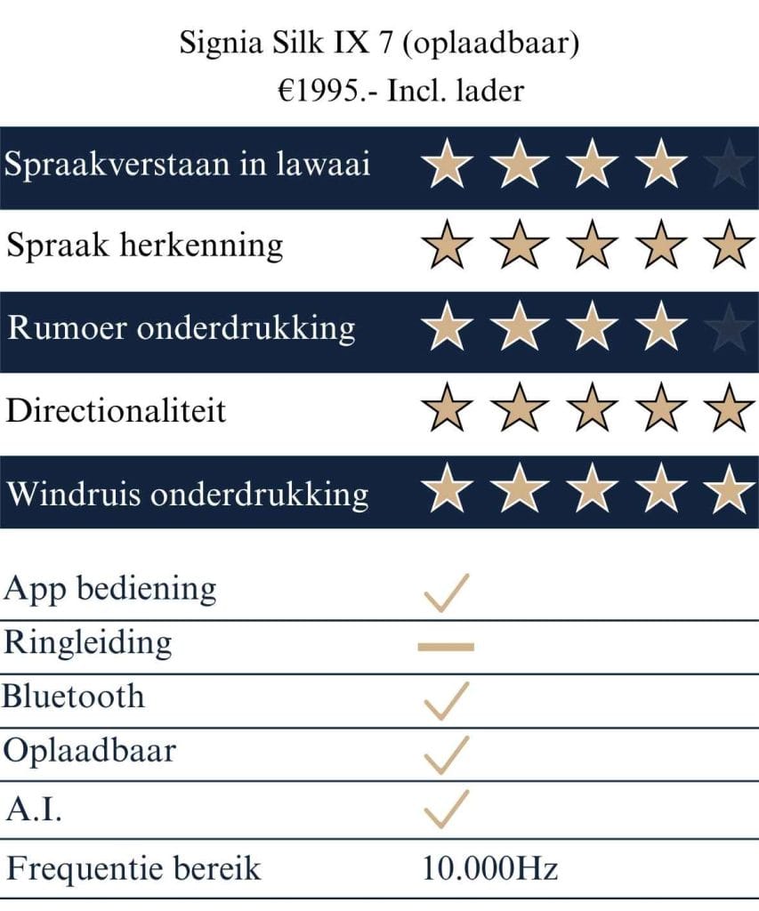 De Signia Silk Charge&Go IX is een significante verbetering ten opzichte van de Silk X, met name op het gebied van audiologische techniek. Een unieke eigenschap is de directionele technologie (Binaural OneMic Directionality), die helpt bij het detecteren, deelnemen aan en voeren van gesprekken in lawaaierige omgevingen.
